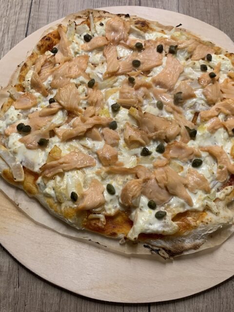 Het kort meebakken van de gerookte zalm geeft een intense smaak die versterkt wordt door de citroen-mascarpone.