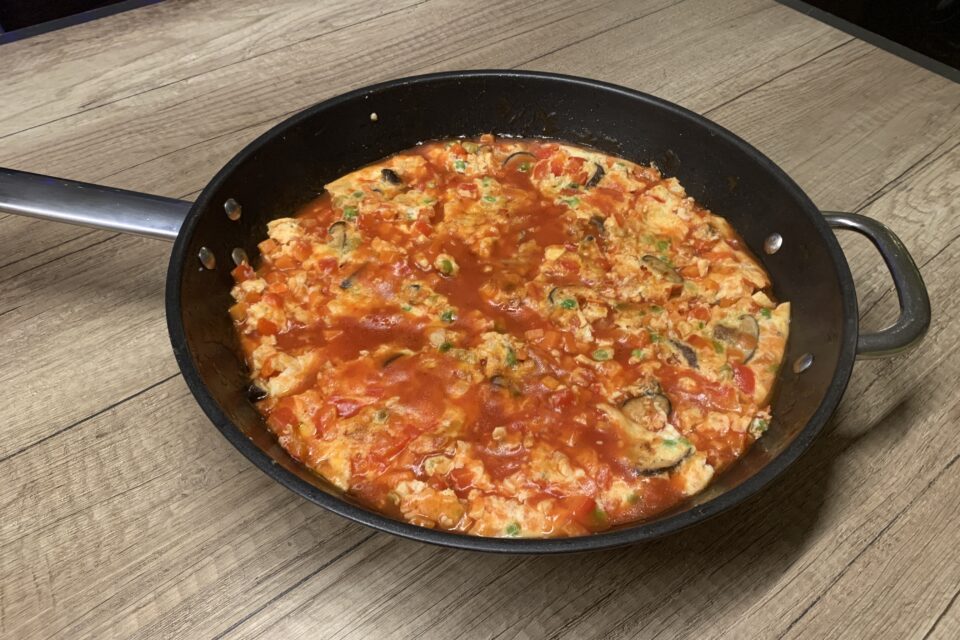 Snijd voor de omelet zelf de champignons in plakjes, de paprika in kleine reepjes en de wortel in kleine blokjes. Kook de wortel een paar minuutjes voor. Klop de eieren los en voeg alle groenten toe, beetje zout en peper erdoorheen. Bak het ei in de resterende kruidenolie. Als het ei gaar is, snijd je het in stukken en voeg je de saus toe. Laat nog even doorwarmen.