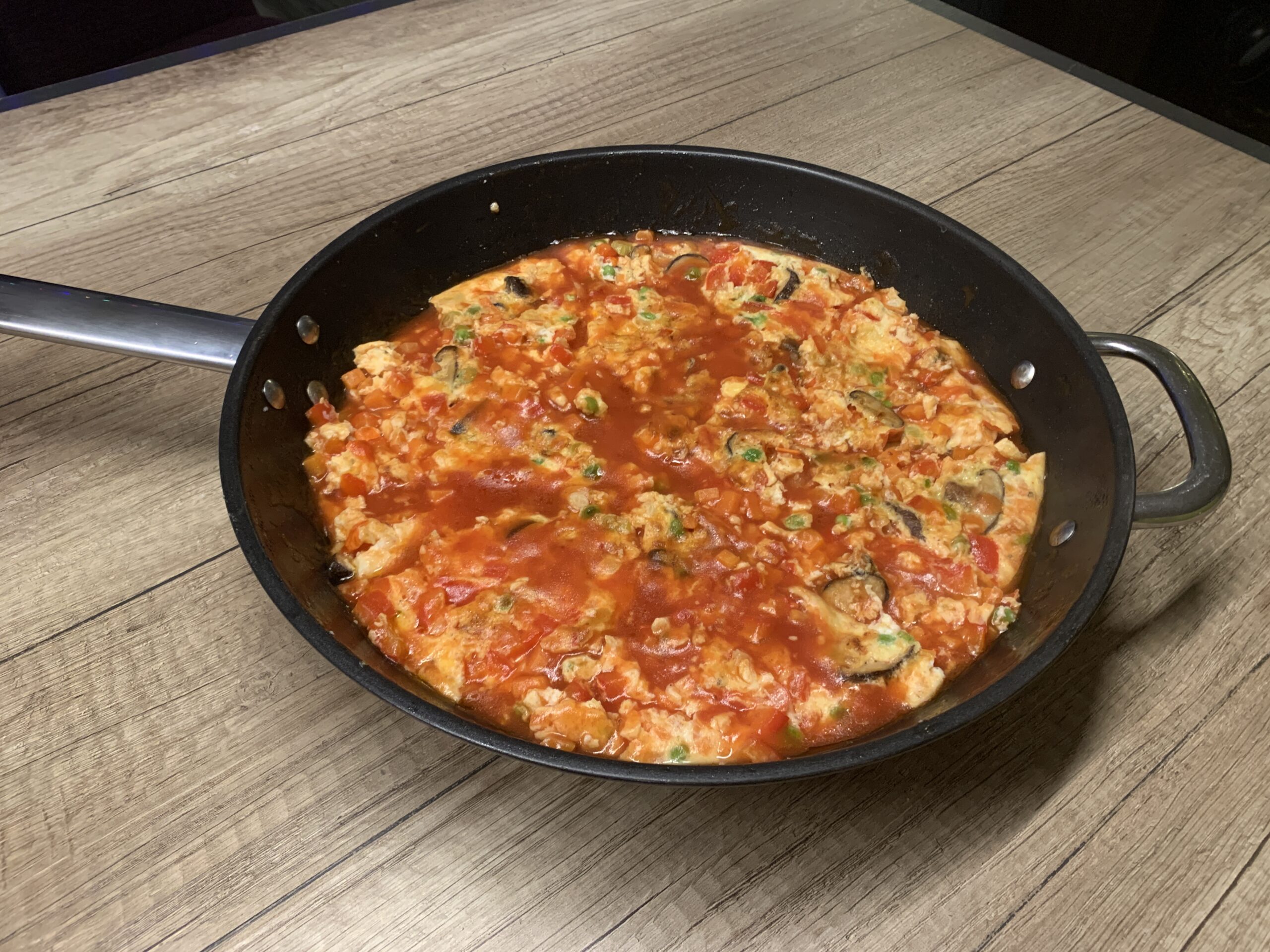Snijd voor de omelet zelf de champignons in plakjes, de paprika in kleine reepjes en de wortel in kleine blokjes. Kook de wortel een paar minuutjes voor. Klop de eieren los en voeg alle groenten toe, beetje zout en peper erdoorheen. Bak het ei in de resterende kruidenolie. Als het ei gaar is, snijd je het in stukken en voeg je de saus toe. Laat nog even doorwarmen.