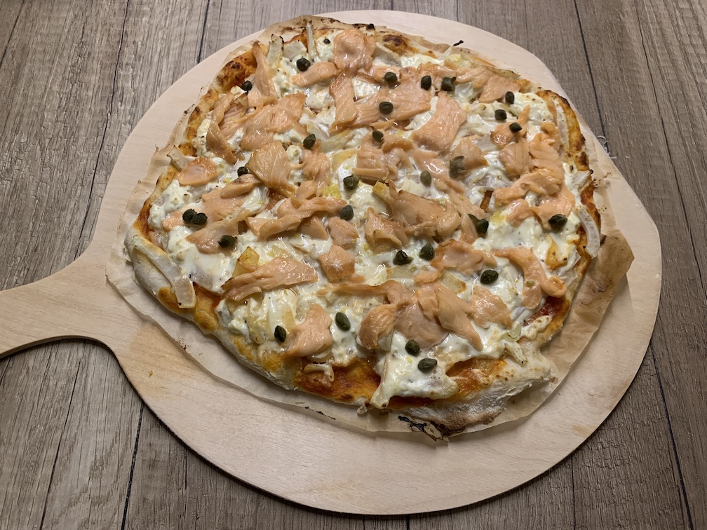 Bestrijk de pizza nu met de mascarpone. Beleg met de gerookte zalm en kappertjes en bak de pizza nog een paar minuten tot hij gaar is. Besprenkel de pizza’s met extra citroensap en olijfolie naar smaak en garneer eventueel met wat rucola.