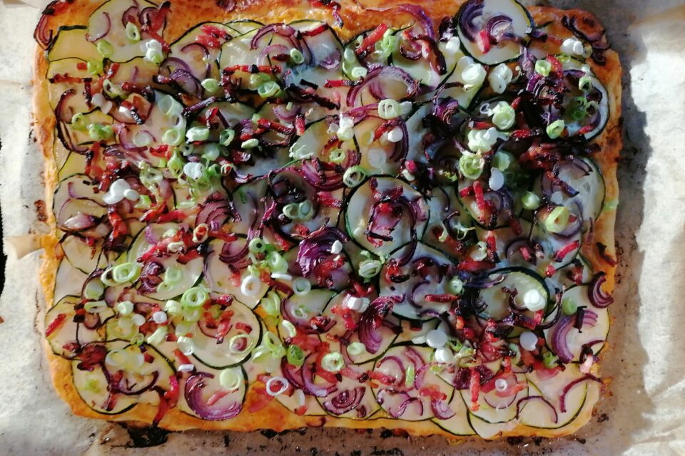 Meng de crème fraîche met de currypasta en smeer dit over het bladerdeeg. Verdeel hierover de courgette (dunne plakjes), uien (dunne ringen), gember (smalle reepjes) en spekjes. Bak in 15-20 minuten gaar. Eventueel garneren met ringetjes lente-ui en gesnipperde koriander.
